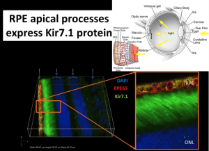 Ion channelopathies are diseases caused by defective ion channels. Ion channels are membrane proteins distributed throughout the human body and mediate cell-cell communication through passage of specific ions into or out of cells. Patients with a specific potassium channel gene (KCNJ13, encoding Kir7.1 protein present in the Retinal Pigment Epithelium RPE) coding variants are diagnosed with a spectrum of blindness phenotypes: Snowflake Vitreoretinal Degeneration (SVD) and Lebers congenital Amaurosis (LCA).  Dr. Pattnaik has shown that a loss-of-function in the Kir7.1 channel disrupts RPE and photoreceptor cell communication using ectopic expressions and a mouse model that demonstrate pathological features in carriers.