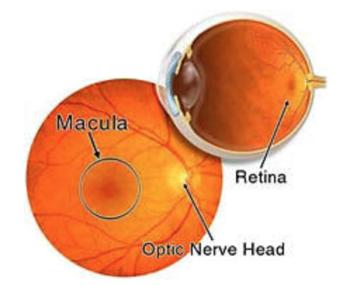 Shown at left is a diagrammatic sketch of the eye, with its various parts, and at right, a colored photograph of the retina. The large pale circle is the optic disc where arteries and veins enter the retina. The darker red area is the macula, used for seeing color and detail.